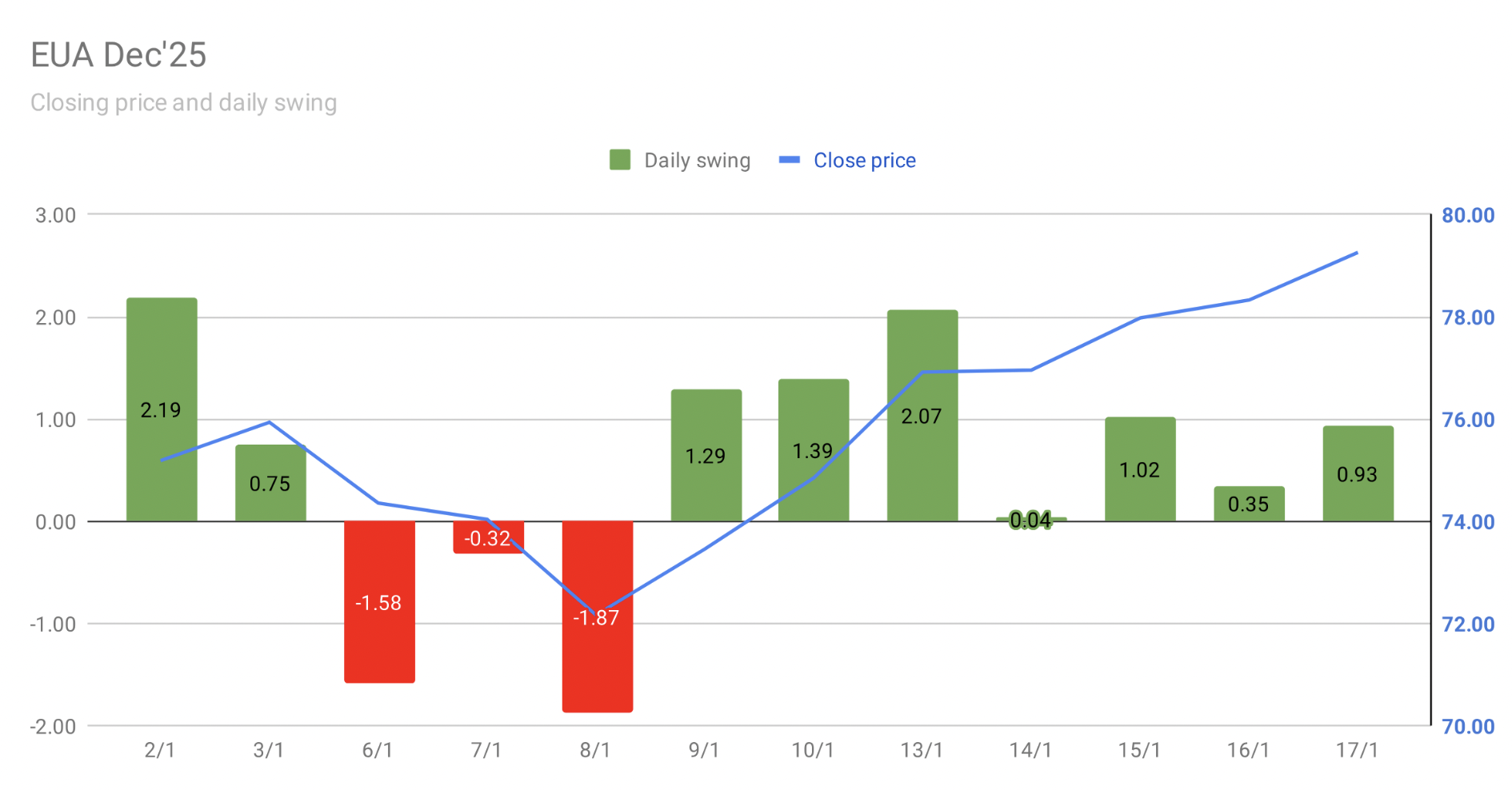 Contractele EUA Dec’25 au avut un inceput in forta, castigand peste 10 euro de cand au devenit valoare de referinta, apreciindu-se in 9 din cele 12 sedinte organizate in acest an.