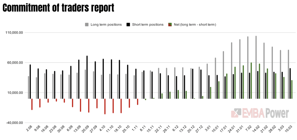 In pofida cresterilor recente inregistrate de pretul carbonului, declansate de optimismul tot mai mic legat de un eventual acord de pace, cel mai nou raport Commitment of Traders (CoT) publicat de platforma ICE a aratat ca fondurile de investitii si-au redus investitiile pe termen lung pentru a patra sedinta consecutiv, ajungand la un total de 31 milioane de certificate. Aceste date de piata sugereaza ca investitorii sunt mai putin increzatori in sansele de crestere a pretului fata de cum erau in urma cu o luna.