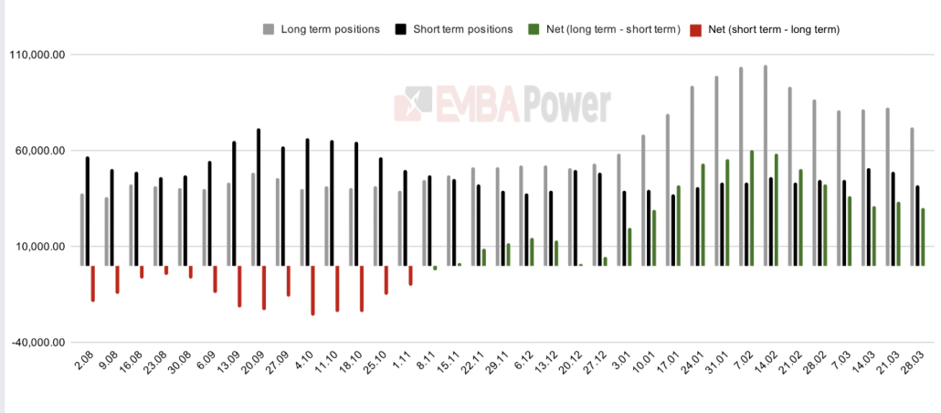 Figure shows that, in the week ending March 28, speculators have reduced their long holdings by 12% from 82,4 million allowances to 71,9 million allowances. During the same interval, funds have reduced their short investments by 7,3 million allowances from 49 million allowances to 41,7 million allowances.