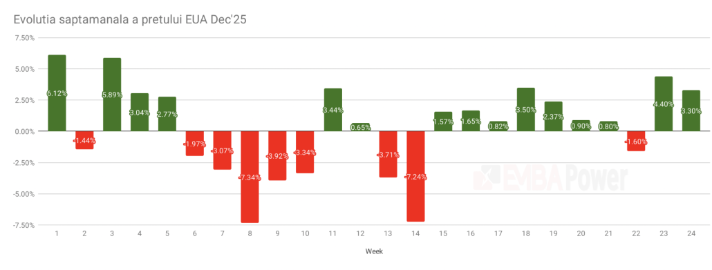 Luni dimineata, preturile certificatelor europene de carbon par deconectate de evolutia gazelor. Pretul pentru EUA Dec’25 este mai degraba oscilant , in timp ce contractul TTF cu livrare front month continua trendul ascendent, ajungand pana la 39,00 euro in tranzactionarea de dimineata, cel mai ridicat nivel de dupa 8 aprilie. Ne asteptam ca atentia principala a pietei in aceasta saptamana sa ramana pe evoluita conflictului din Orientul Mijlociu.