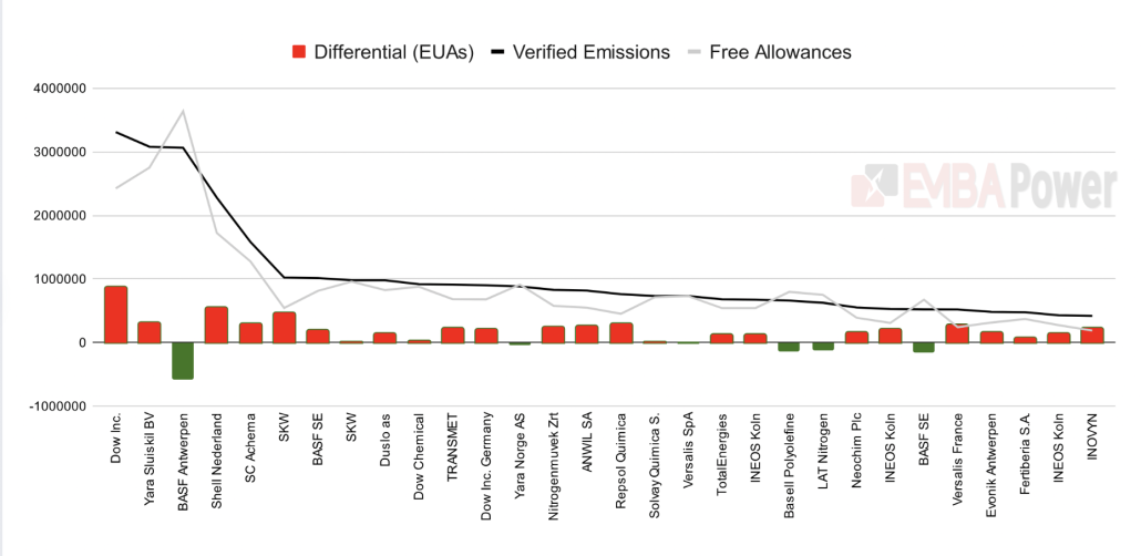 In 2024, the 30 largest chemical installations in the EU received approximately 26.6 million free allowances, while their combined emissions totaled 31.4 million metric tons of CO₂. Furthermore, five installations actually received more allowances than they emitted, with BASF leading the way — holding a surplus of more than half a million EUAs.