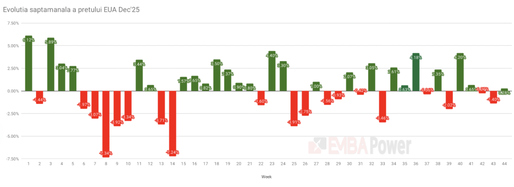 On the European carbon market, the week ended with a marginal gain of 0.28%, indicating a continued lack of clear directional momentum. Nevertheless, despite this short-term stability, October closed 3.72% higher, marking the fourth consecutive monthly increase in EUA prices.