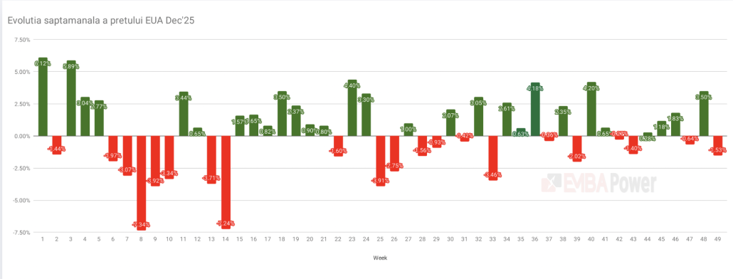 Pe langa volatilitatea tipica dinaintea expirarii optiunilor programata in doua zile, sunt asteptate fluctuatii suplimentare ale pietei pe masura ce contractul EUA Dec ’25 se apropie de maturitate, respectiv pe 15 decembrie si investitorii speculativi se grabesc sa isi marcheze profiturile inainte de finalul anului.