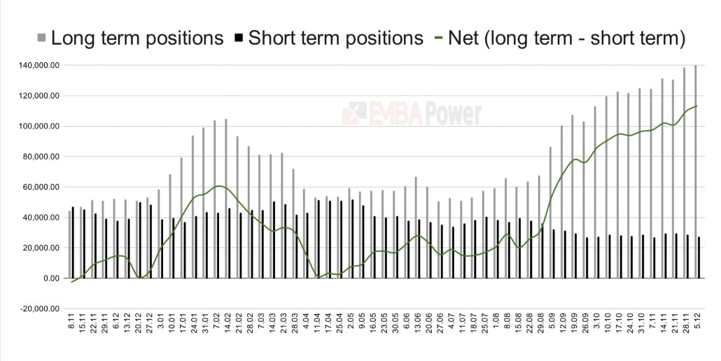 Traderii speculativi au adaugat 2,1 milioane de alocari la pozitiile lor pe termen lung, ducand totalul la 140,8 milioane, in timp ce si-au redus simultan expunerea pe termen sucrt cu aproape 1,4 milioane, pana la 27,5 milioane de alocari, cel mai scazut nivel inregistrat de la inceputul lunii octombrie.