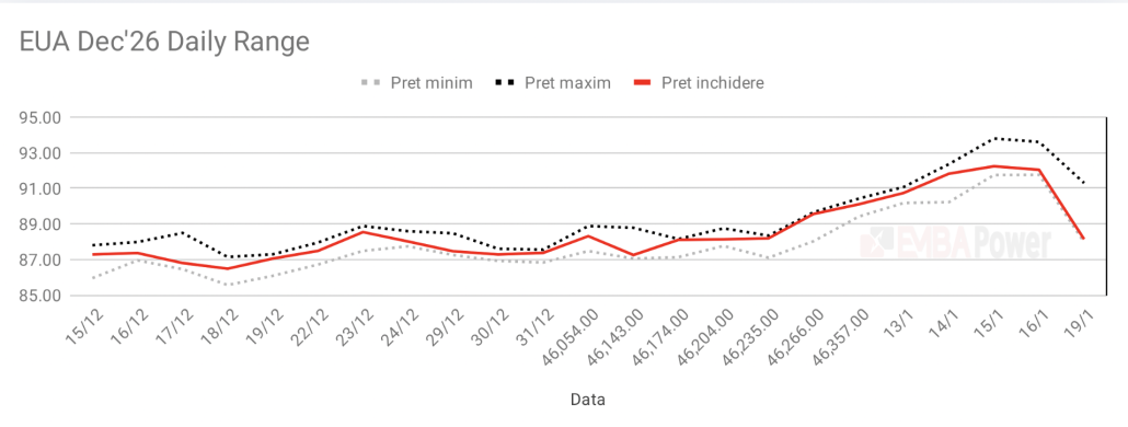 Preturile carbonului european si-au continuat declinul marti, cotatia pentru EUA Dec’26 coborand sub pragul de 86 euro pentru prima data in mai mult de o luna. Se asteapta ca volatilitatea sa ramana ridicata, cu atentia principala indreptata asupra tensiunilor comerciale dintre SUA si UE.