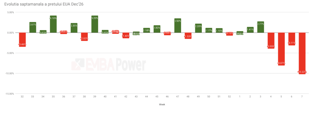 Saptamana trecuta s-a incheiat cu pierderi semnificative pe piata europeana a carbonului, contractul EUA Dec’26 stabilindu-se la 70,68 euro, cel mai scazut nivel de inchidere din inceputul lunii mai 2025. Pretului carbonului a scazut cu 10% fata de vinerea anterioara, marcand cea mai abrupta scadere saptamanala din ultimii doi ani si prelungind seria de pierderi la patru saptamani consecutive.
