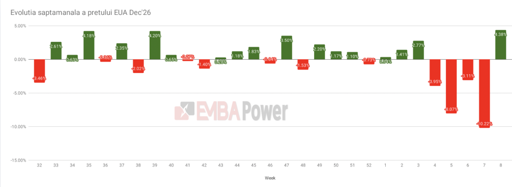 Comparativ cu vinerea precedenta, contractul a inregistrat un avans saptamanal de 4,38%, prima crestere dupa patru saptamani consecutive de scaderi. A fost, de asemenea, cea mai puternica performanta saptamanala din iunie anul trecut. Chiar si asa, nivelul inregistrat vineri ramane cu aproximativ 20 de euro sub varful multianual atins la mijlocul lunii ianuarie.