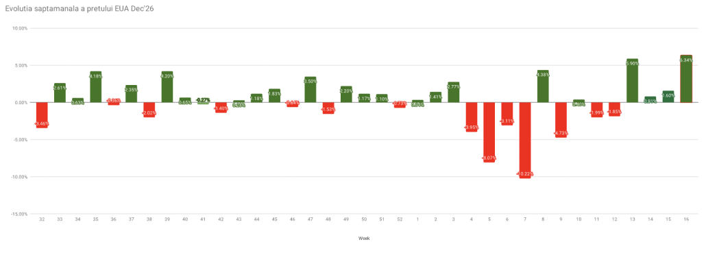 La finalul sesiunii de vineri, EUA-urile s-au stabilit la 74 euro, inregistrand doar modificari minore fata de inchiderea de joi, de 74,85 euro, dar consemnand totusi un declin saptamanal de 3,3%. De asemenea, merita mentionat faptul ca preturile carbonului se consolideaza in jurul nivelului de 75 euro, nivel pe care Ursula von der Leyen l-a semnalat dupa reuniunea Consiliului UE din martie drept „un nivel corect”.